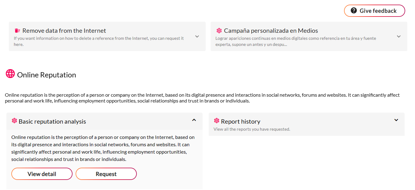 The new service Online reputation allows you to obtain an assessment of your reputation throughout the internet, scoring the results to, in a simple way, evaluate your reputation index.
